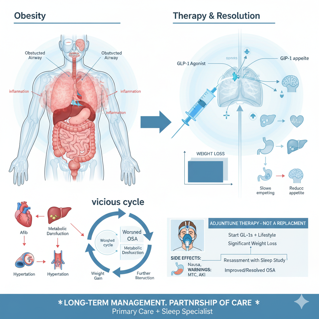 Collaborative Care: Effective care requires collaboration between primary care providers (GPs) (often initiating GLP-1s) and sleep specialists to ensure proper diagnosis, ongoing management, and timely objective reassessment of OSA status.
